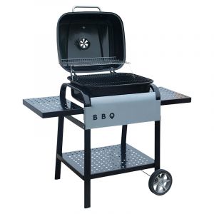 Parrilla de carbón 134 x 66 x 105 cm Basic Living. Nuestra parrilla a carbón es la compañera perfecta para sus asados al aire libre. Con un termómetro integrado para un control preciso de la temperatura, una tapa con mango suave y salida de aire incorporada para un ahumado perfecto, y ruedas grandes que facilitan su transporte, esta parrilla le brinda la versatilidad y comodidad que busca. Además, la mesa plegable auxiliar y el estante inferior adicional le ofrecen espacio extra para preparar y servir sus platillos.